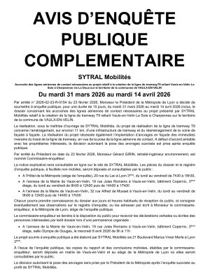 - Permanence du Commissaire-enquêteur : Monsieur Gérard Girin recevra le public le mercredi 8 avril 2026, de 9h00 à 11h00, à la mairie annexe de Vaulx-en-Velin (19 rue Jules Romains, salle Olympe de Gouges).